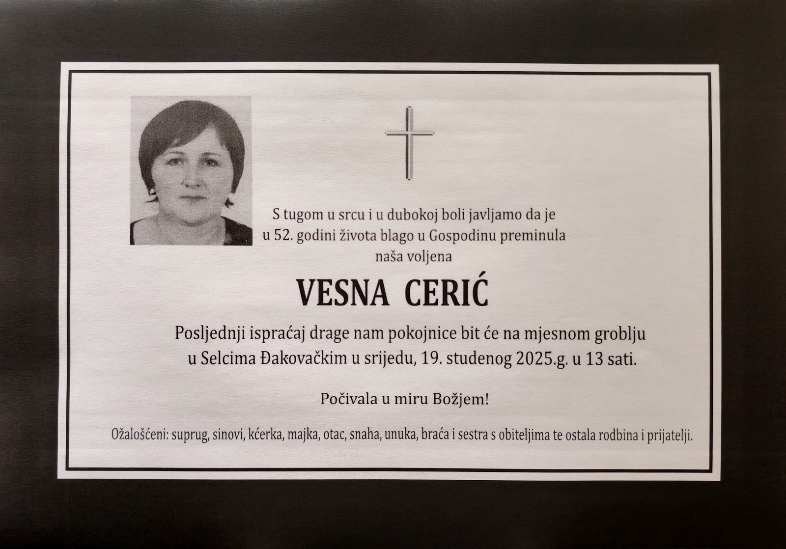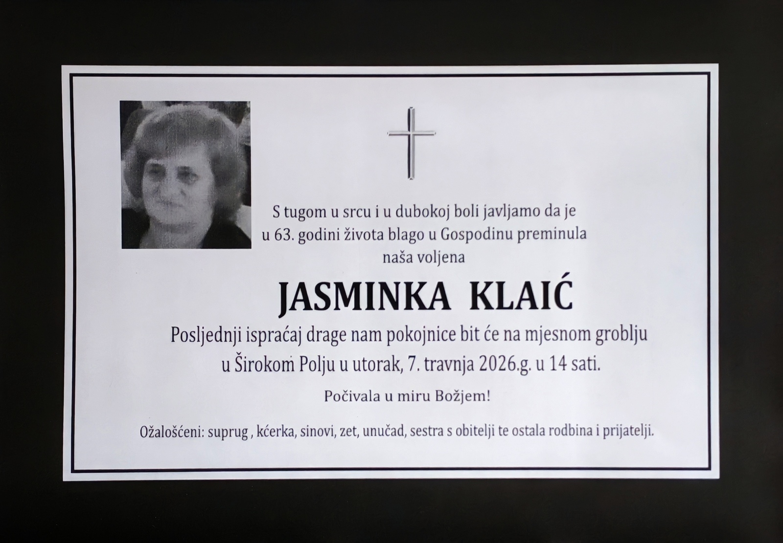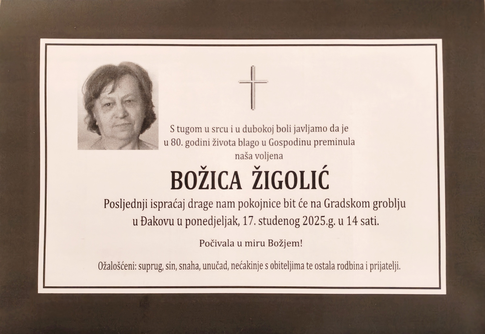 14 sati: MARIJA BOŠNJAKOVIĆ (67) osmrtnica