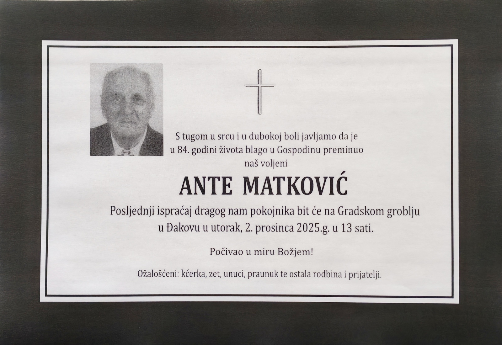 13 sati: ANTE MATKOVIĆ (83) osmrtnica