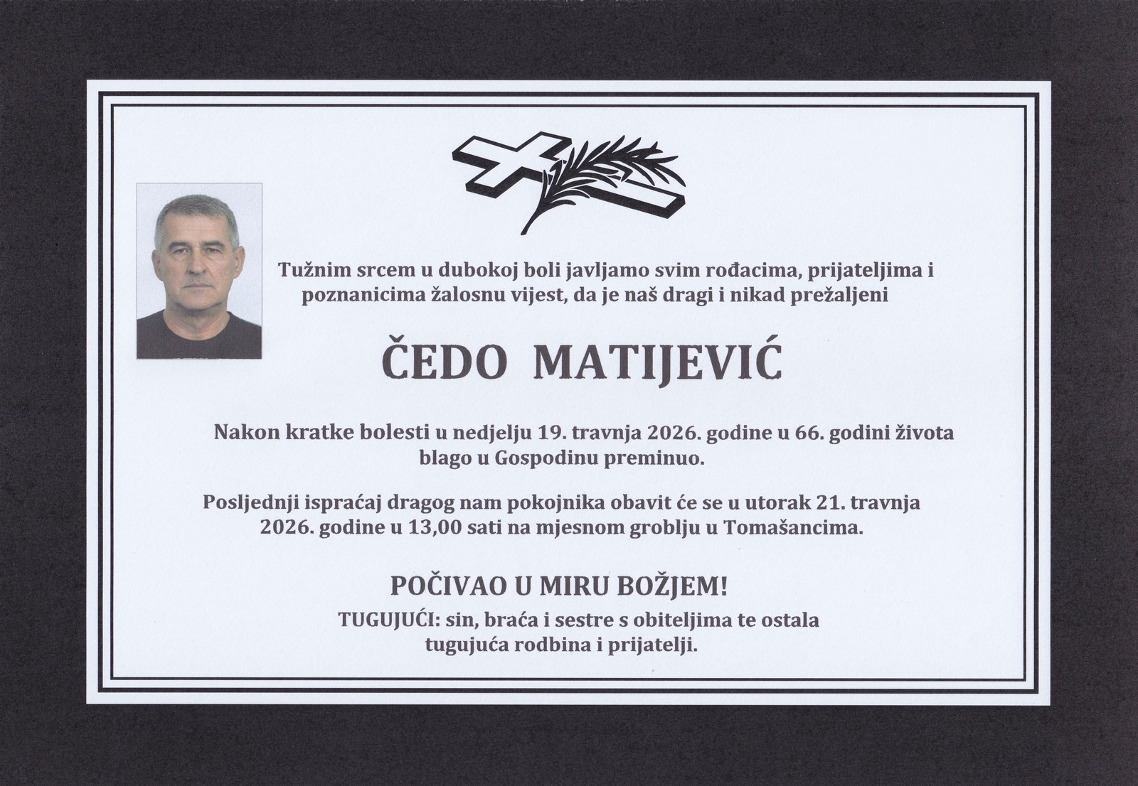 13 sati: ČEDO MATIJEVIĆ (65) osmrtnica
