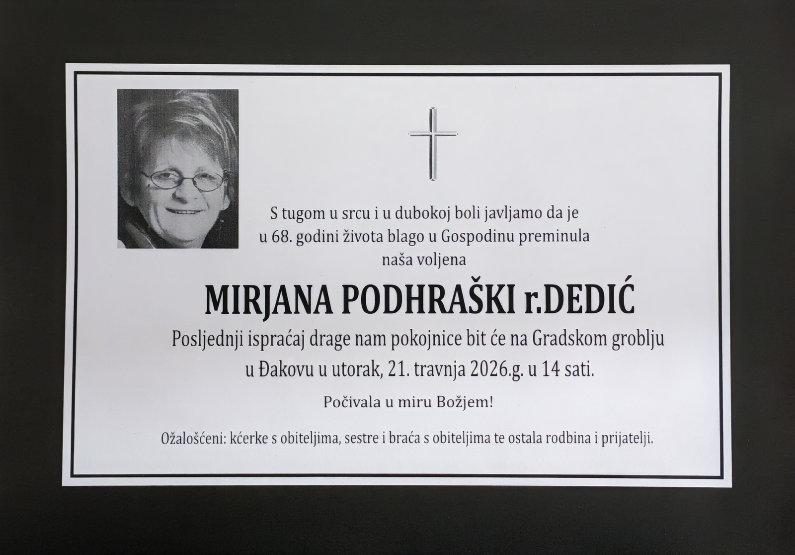 14 sati: MIRJANA PODHRAŠKI (67) osmrtnica