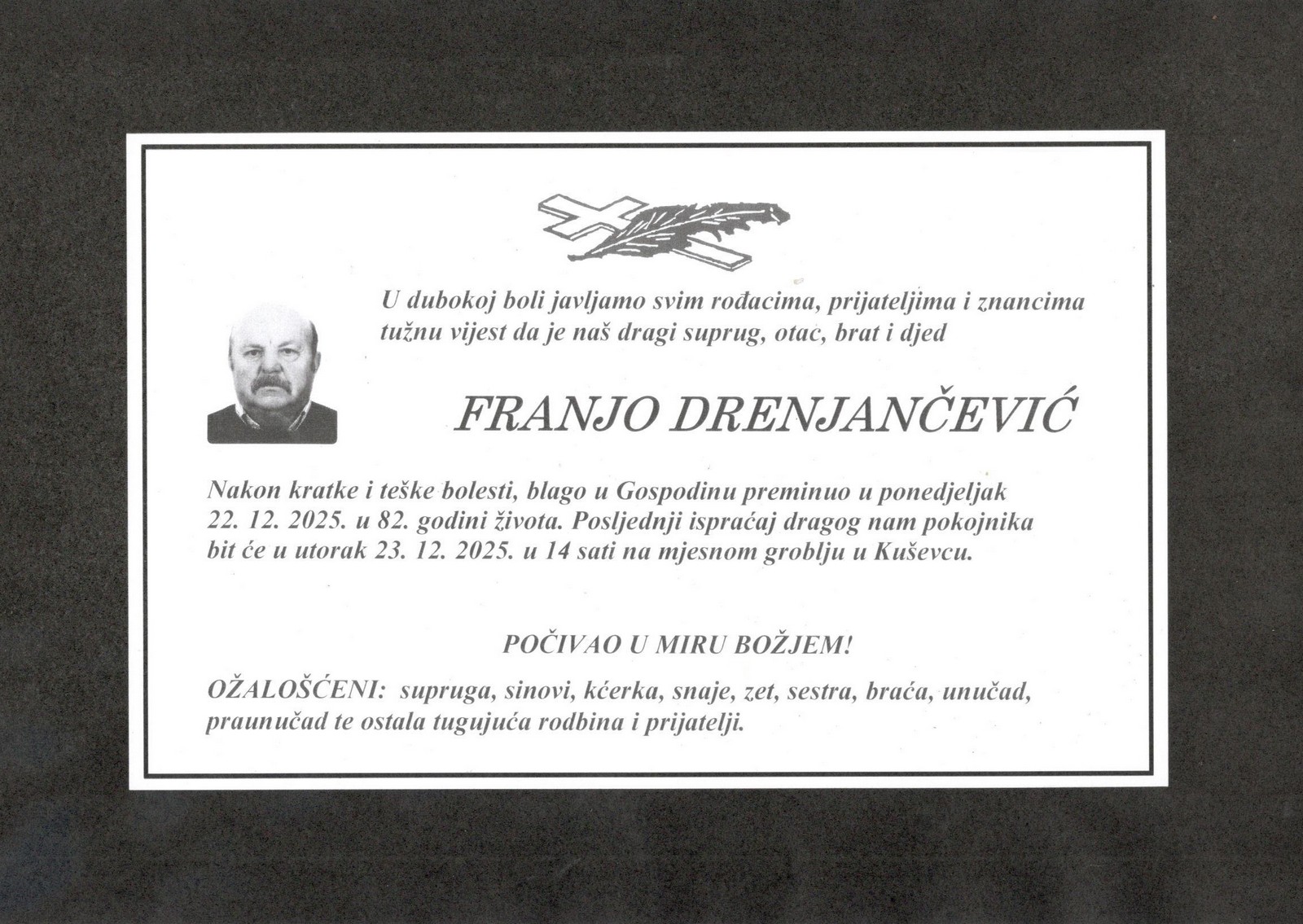 14 sati: FRANJO DRENJANČEVIĆ (81) osmrtnica