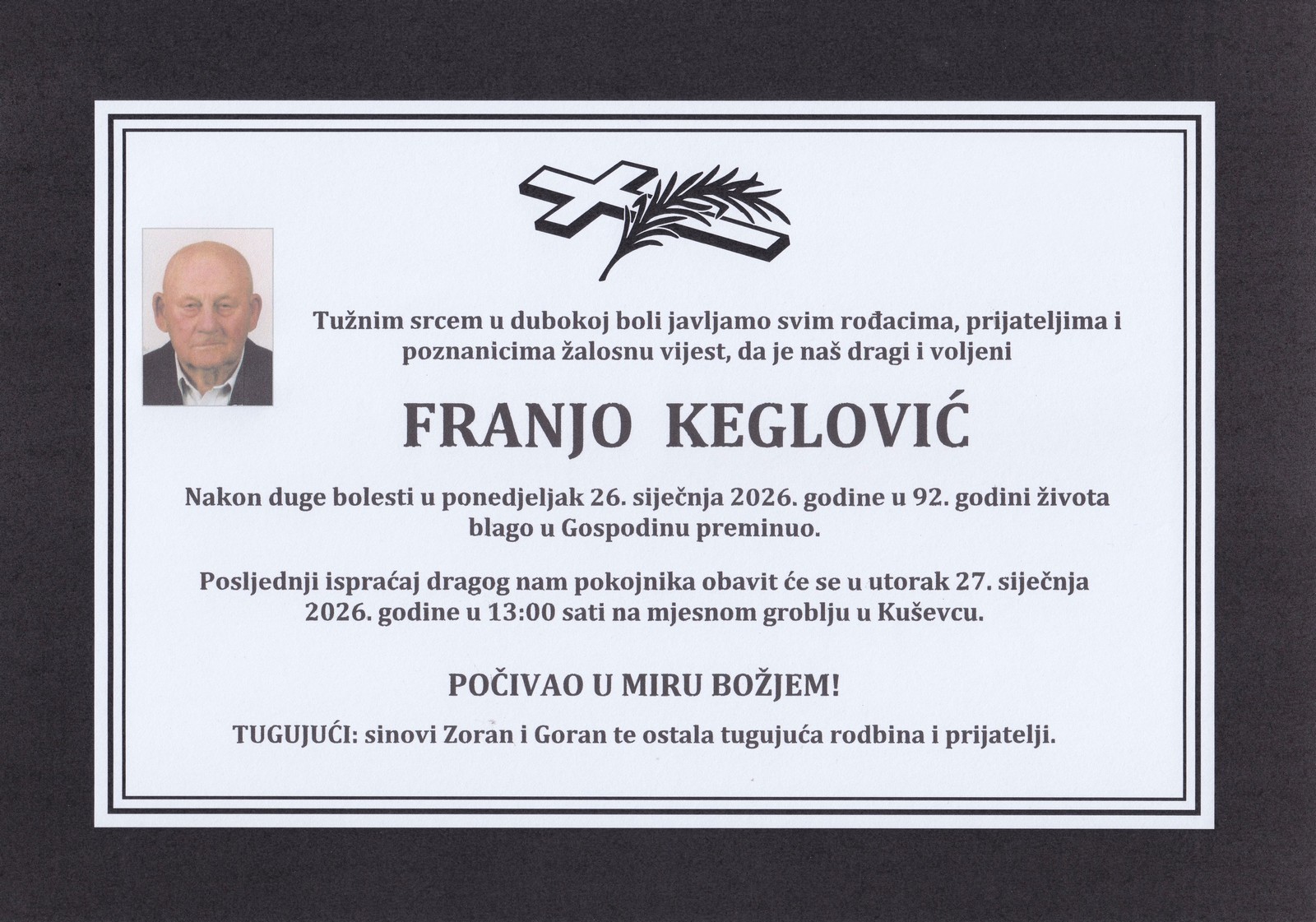 13 sati: FRANJO KEGLOVIĆ (91) osmrtnica