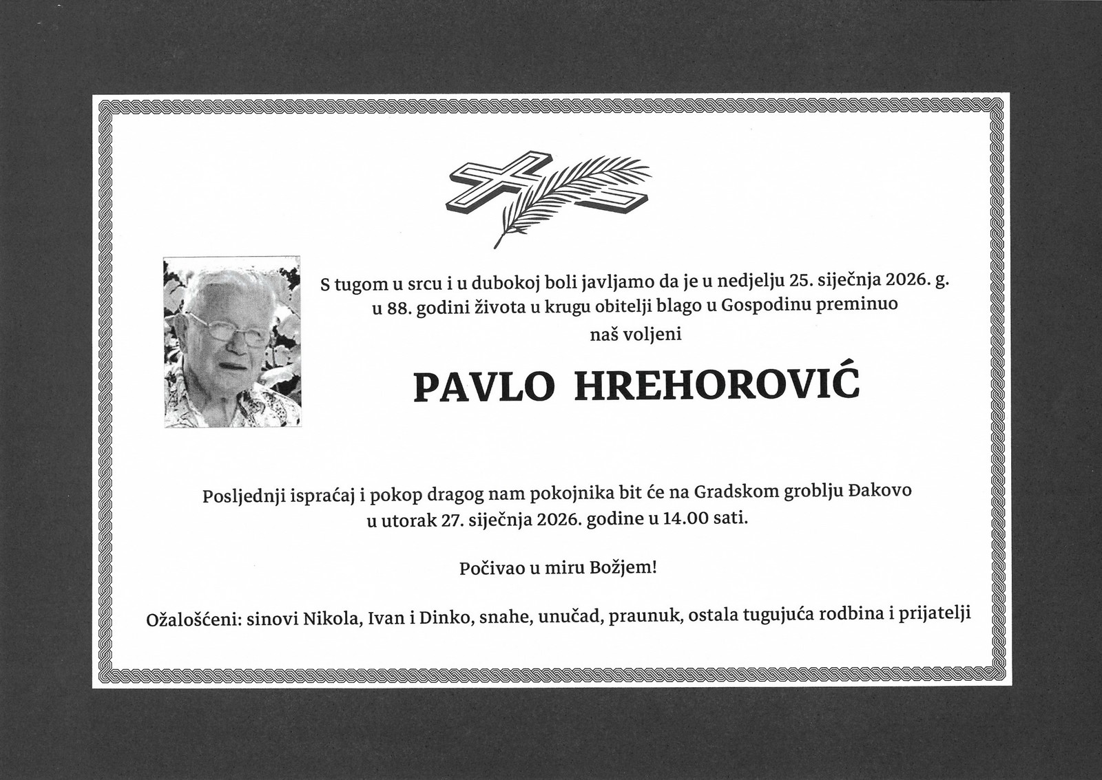 14 sati: PAVLO HREHOROVIĆ (87) osmrtnica